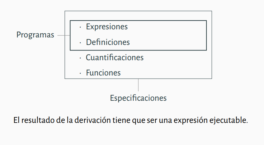 Especificaciones: Son formas precisas y formales de expresar qué debería cumplir un programa para ser solución del problema que se desea solucionar. Para especificar se usan herramientas matemáticas que permiten expresar muchas “fórmulas” o “cuentas” de manera simple y breve. Una especificación siempre va a mencionar el programa solución diciendo qué hace el programa, pero nunca cómo lo hace. En general no será posible que una computadora entienda o ejecute una especificación.